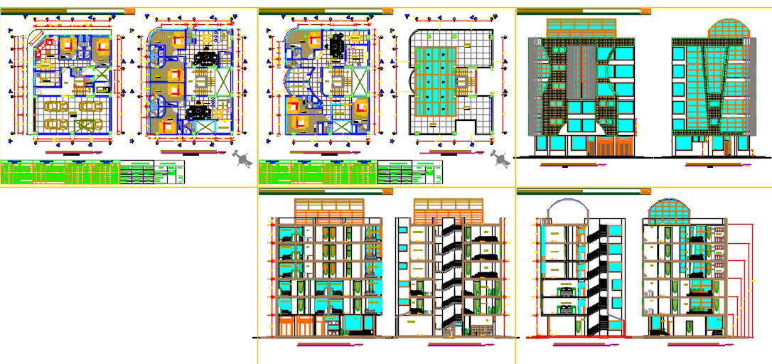 Here is the autocad dwg of apartment building of 6 storeys with its detail civil plan of the apartment building,design elevation of the building,glass facade,furniture layout.