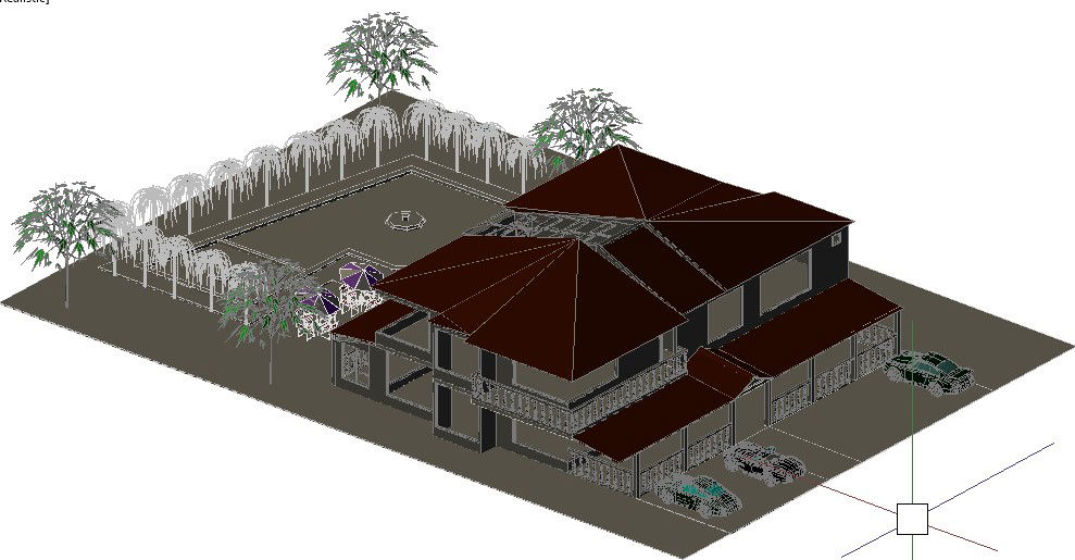 Here is the autocad dwg of 3d house design,rendered elevation of the house in autocad 3d file,garden and landscape of the bungalow.