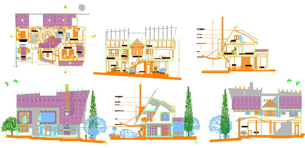 Here is the autocad dwg of single family home,consists of furniture layout,proposed elevation of the bungalow,design elevations,proposed layout ,rendered elevation of the home.