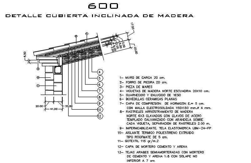Here is the autocad dwg of inclined roof wooden with stone lining,detail sectional elevation of the wall.