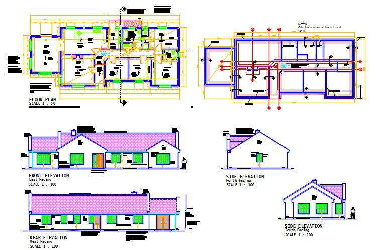 Here is the autocad dwg of house project,floor plan of the house,civil site plan of the house,elevations,left side and right side view elevation,front elevation and rear view elevation.