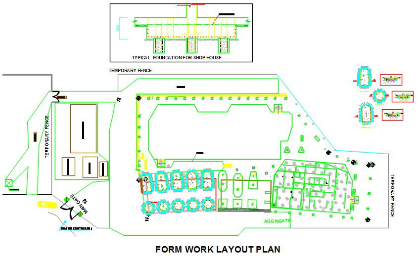 Here is the autocad dwg of form shop house,consists of floor plan of shop house,form work layout plan,typical foundation,temporary fence plan.
