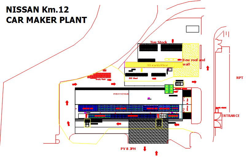 Here is the autocad dwg of nissan car maker plant,consists of presentation plan of plant includes tire stock area,entrance,office cabin etc.