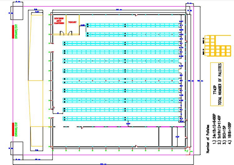 Here is the autocad dwg of trading warehouse,proper detail plan of warehouse with palettes detail plan.