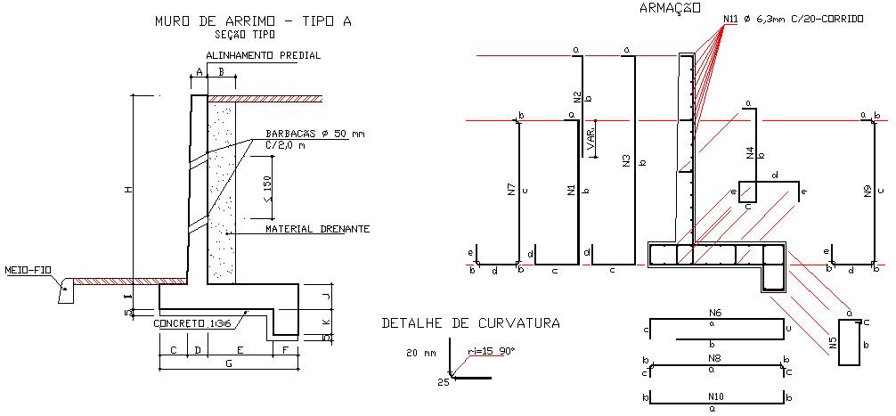 Here the detail drawing of wall of bring closer armed concrete showing sections with dimensions and proper specification in autocad drawing.