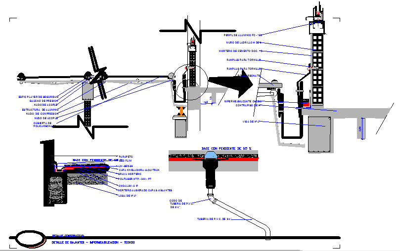 Here the detail drawing of unevenness showing sections and views of waterproofing roofs, etc in autocad drawing.