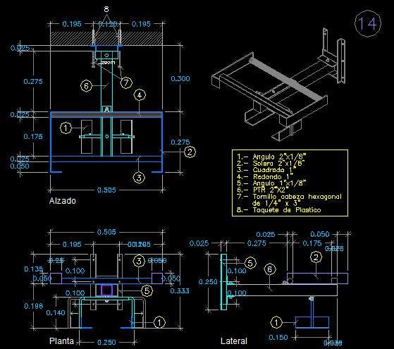 This TV and Video Stand CAD Drawing (AutoCAD DWG file) provides a complete structural and dimensional layout designed for interior furnishing and product detailing. The drawing includes plan, front elevation (Alzado), lateral view, and isometric projection, each precisely measured and dimensioned for practical manufacturing or design purposes. The file also features exact measurements such as 0.505m base width, 0.275m side clearance, and 0.300m overall height, along with a complete material list including angles, square tubes, hexagonal head screws, and plastic caps.