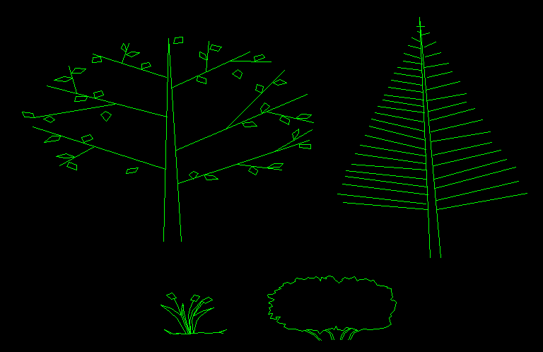 This Tree Front View CAD Drawing (AutoCAD DWG file) provides a well-detailed 2D elevation of multiple tree types, shrubs, and natural landscape elements. The file includes a broadleaf tree, a pine tree, a grass patch, and a bush elevation, designed to represent realistic vegetation in architectural and site drawings. Each object is drawn to scale and outlined with precision, making it perfect for use in architectural facades, landscape sections, and garden layouts.
