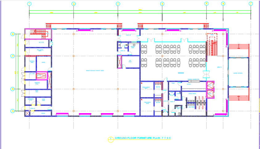 Here in this autocad dwg file there is the furniture layout drawing for Building ground floor furniture plan . It shows the dimensions, architectural features .