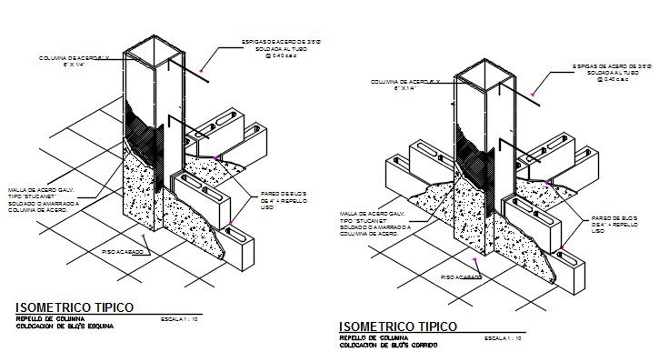 Here is the autocad dwg of mooring of blocks in steel columns,isometric view of brick walls.