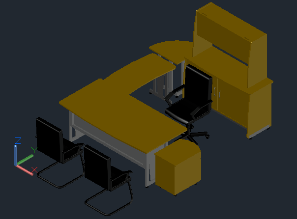 Here is an autocad dwg file where there is a 3D view of the desk for office with its chair and appropriate space planning with all detailing.