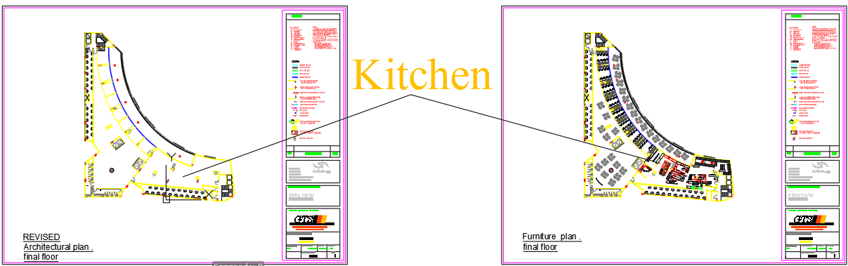 Here is an autocad dwg file for Furniture plan final floor . there is revised architectural plan for final floor , furniture layout drawing , and marked kitchens .