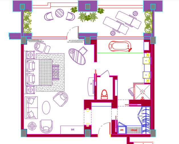 Here in this autocad dwg file there is the furniture layout plan drawing for Deluxe guest room . there is proper furniture placement with attached bathroom.
