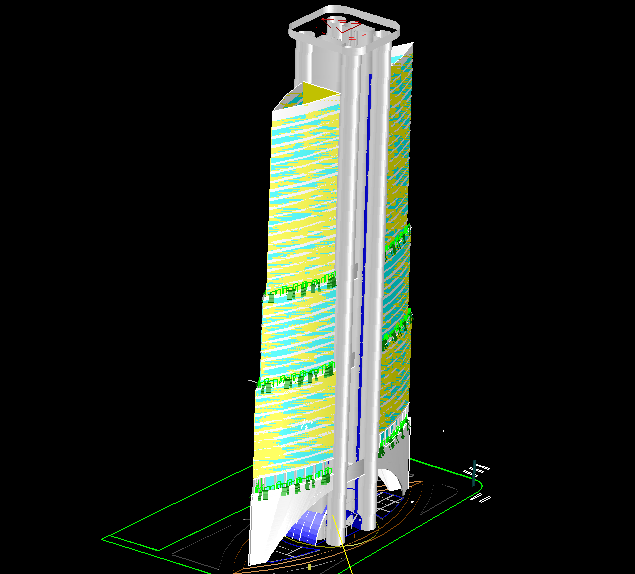 This 3D High Rise Hotel CAD architecture DWG file showcases a highly detailed and visually rich model of a multi-story hotel tower. The structure displays a dynamic façade design with alternating geometric layers and vertical elevation features that emphasize its modern architectural form. Designed with precision, this 3D model provides clear insights into the hotel’s structural framework, core layout, and external detailing, making it suitable for professional use in urban design and construction visualization.