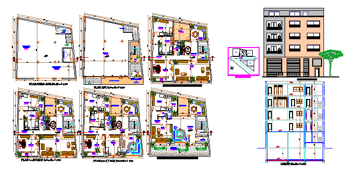 Here the detail drawing of department building with all floor plans showing furniture details, dimensions, vegetation details along with contextual plan and elevation showing all required data with hatching in autocad drawing.