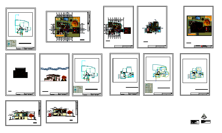 Here the autocad drawing of architectural plans for housing showing different plans with furniture layout, dimensions, electric layout plans, roof plan with surrounding site development, flooring details, along with sections and elevations with surrounding and furniture details with hatching and rendering.
