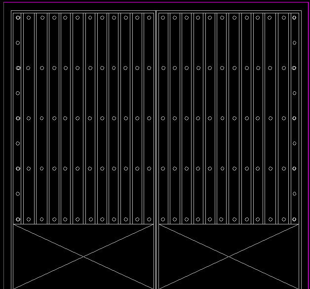 This Garage Gate CAD drawing in DWG format provides a detailed 2D elevation layout perfect for modern residential and commercial architectural plans. The design features a dual-panel garage gate with vertical slats, precision rivet detailing, and diagonal base supports that enhance both strength and appearance. Each element of the gate has been drawn to scale, ensuring dimensional accuracy for fabrication and construction documentation.