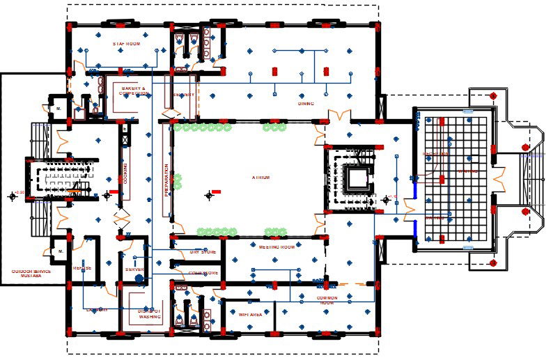 Here is the autocad dwg of guest house,drawing includes propose layout of house,interior layout,guest house includes meeting room,common room,master bedrooms,waiting area,reception area,column layout,civil plan of guest house.