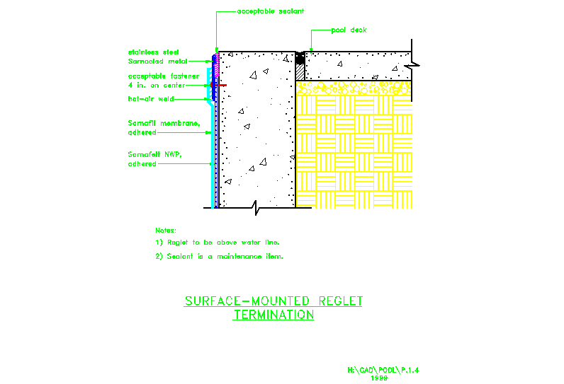 here is the description of Pools membrane placement details with superior border. underwater below gutter termination.