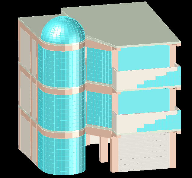 This 3D Bungalow CAD drawing in DWG format presents a highly detailed architectural model showcasing a modern multi-level residential structure. The drawing highlights the complete 3D view of a three-story bungalow with defined façade detailing, including a cylindrical glass tower, balcony structures, and a flat rooftop design. The elevation elements are crafted to depict real-world proportions and materials, providing an accurate architectural reference.