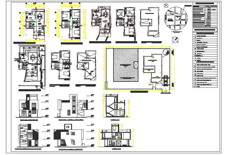 Here the detailed drawing of Ecuador residence showing all floor plans, sections, elevation with furniture layout, dimensions and levels, electric layout plan, terrace slope plan, hatching and redering in elevations, and other small details in autocad drawing.