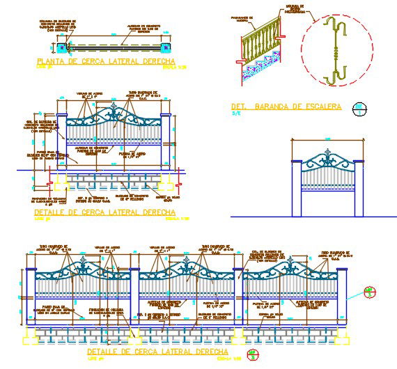 Here is the autocad dwg of railing detail,drawing consists of civil plan of railing,sectional detail of railing,elevation of railing,front elevation,side elevation,design of railing.