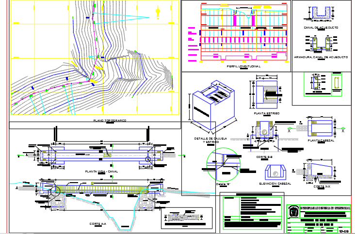 Sectional drawing of aqueduct bridge in concrete with joinery details, structural details,reinforcement details including number of steel bars and their dimension and distance, foundation details and hieght of the bridge in autocad.