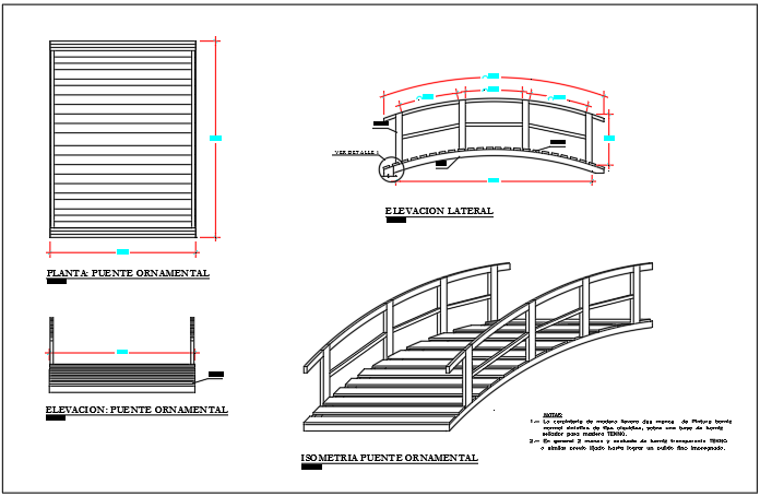 Here is an autocad dwg file for details of the Wooden bridge gang plank . there is a presentation plan layout , elevation details layout , sectional elevation front and back also the perspective 3d view of the bridge with proper detailing.