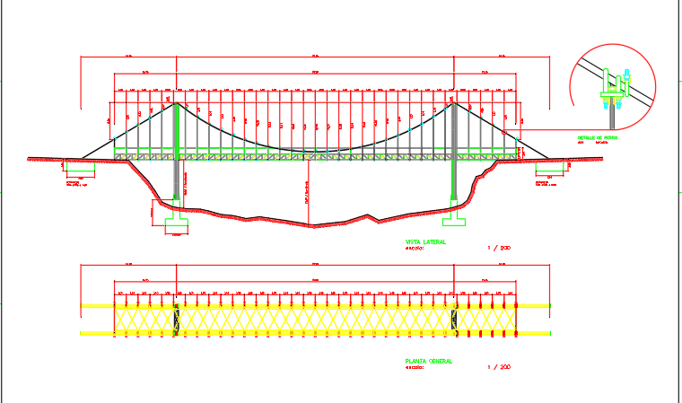 Here is the autocad dwg of hanging bridge ,drawing consists of civil plan of hanging bridge,sectional elevation of hanging bridge,sectional detail.