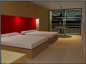This 3D Bedroom CAD Drawing DWG file presents a detailed modern bedroom layout designed with precision and aesthetic balance. The 3D rendered view highlights the placement of two beds, the accent wall design, the furniture arrangement, and the ambient lighting setup. The interior uses a warm color palette complemented by a feature wall with soft red tones, creating a contemporary and cozy atmosphere. Every design element, from furniture proportion to lighting intensity, is carefully represented to enhance visualization and spatial depth for interior designers and architects.