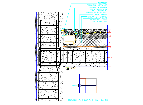 Here the detail drawing of flat roof with plan along with section showing material description, specification of elements,dimension and all other details in autocad drawing.