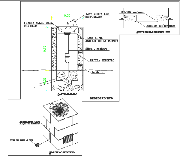 Here the detail drawing of drinking trough type with section, elevation and detail view of tap along with its whole body and foundation with all required details like material description, elements specification, dimensions, etc. in autocad drawing.