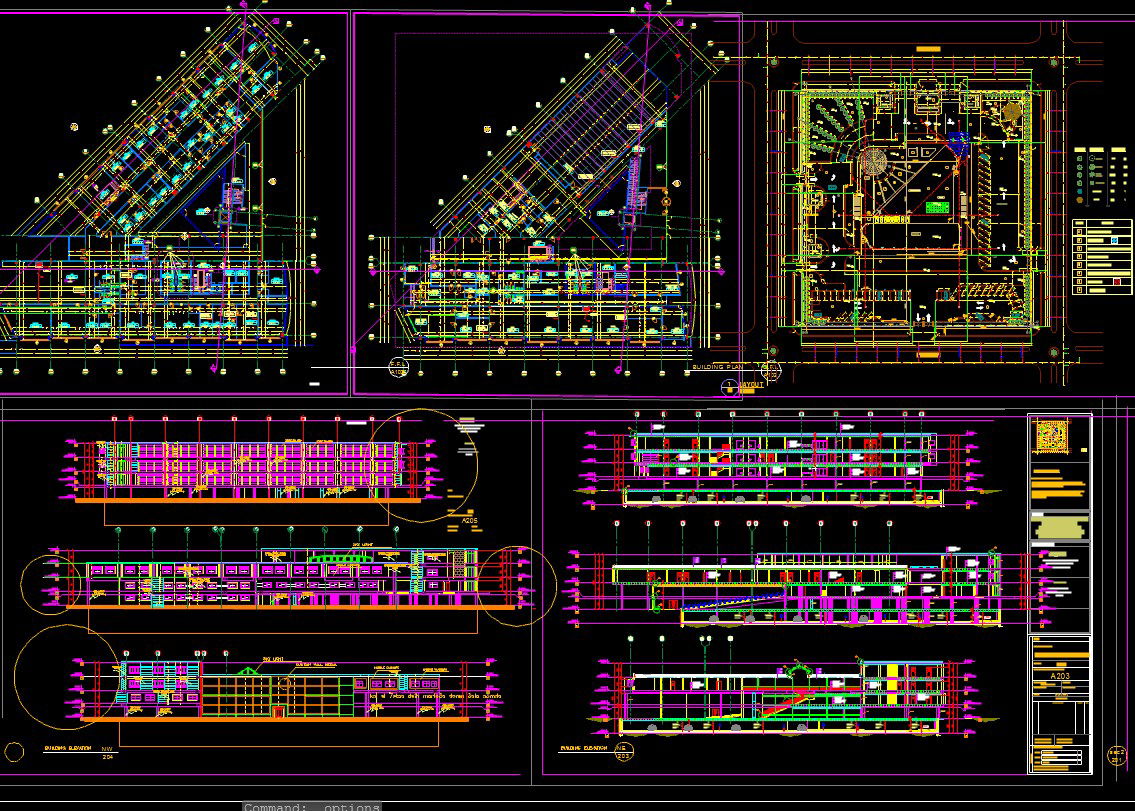 Multiplex Showroom dwg file. The architecture layout plan with furniture detail, section plan, construction plan and elevation design.
