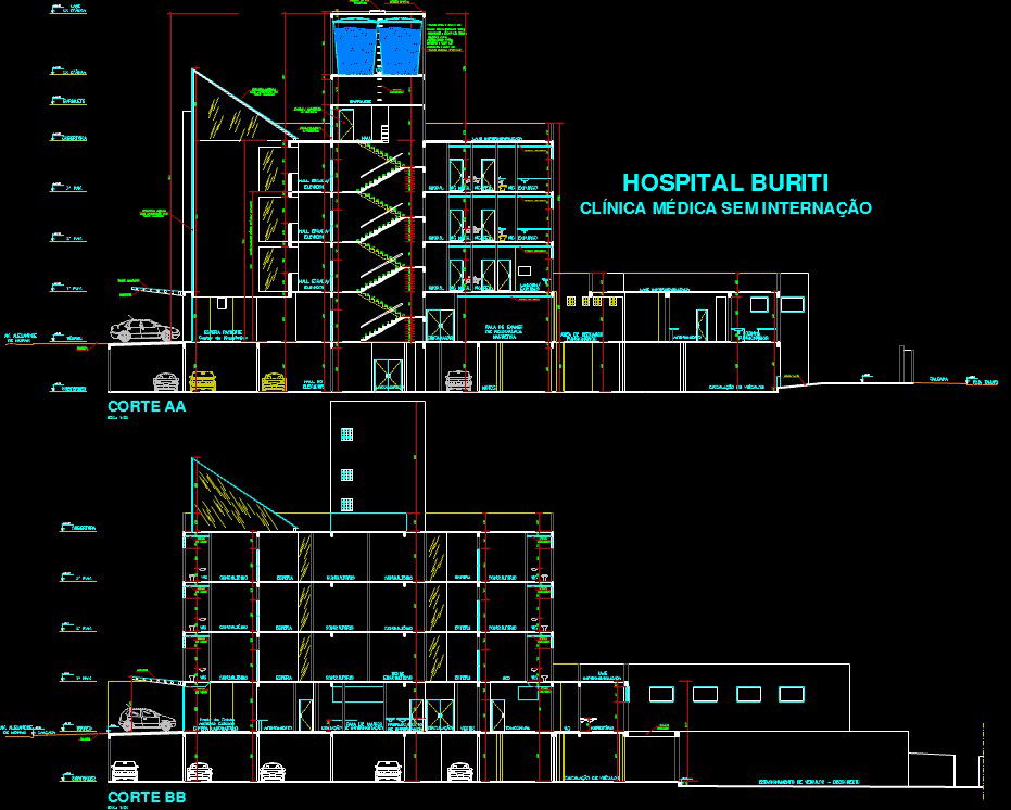 Hospital dwg file. Section plan of hospital project also include the technology alongside bright and open areas where patient can meet and get proper treatment.