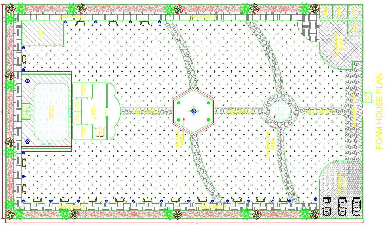 Party Plot dwg file. Layout plan of party plot have detailing of stage, landscaping, fountain and also decorate the entry with color full plant.
