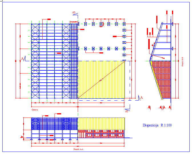 Utilitarian Building dwg file. The architecture layout plan, section plan, roof plan and elevation design.