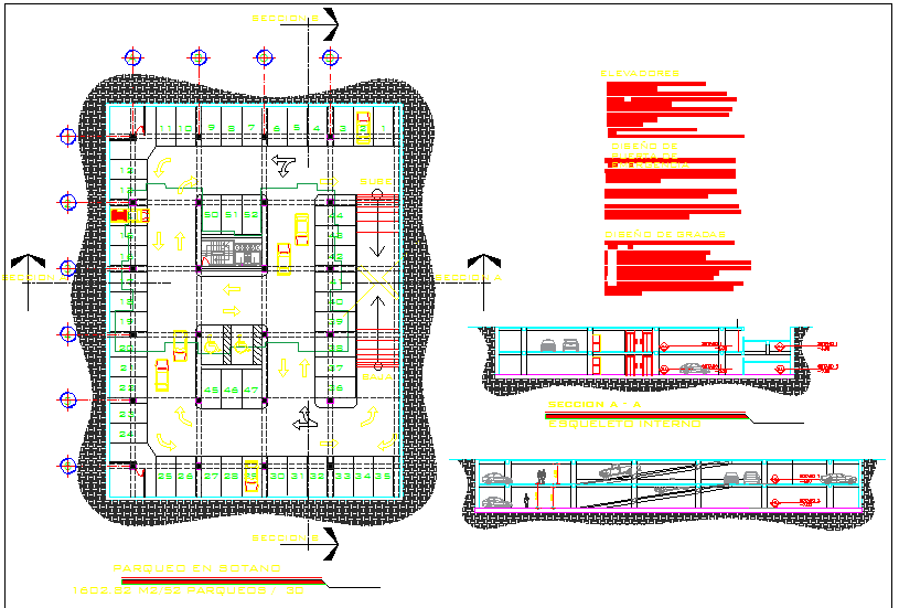 Parking Lot dwg file. Layout plan and section plan are in detailing of vehicle parking project.