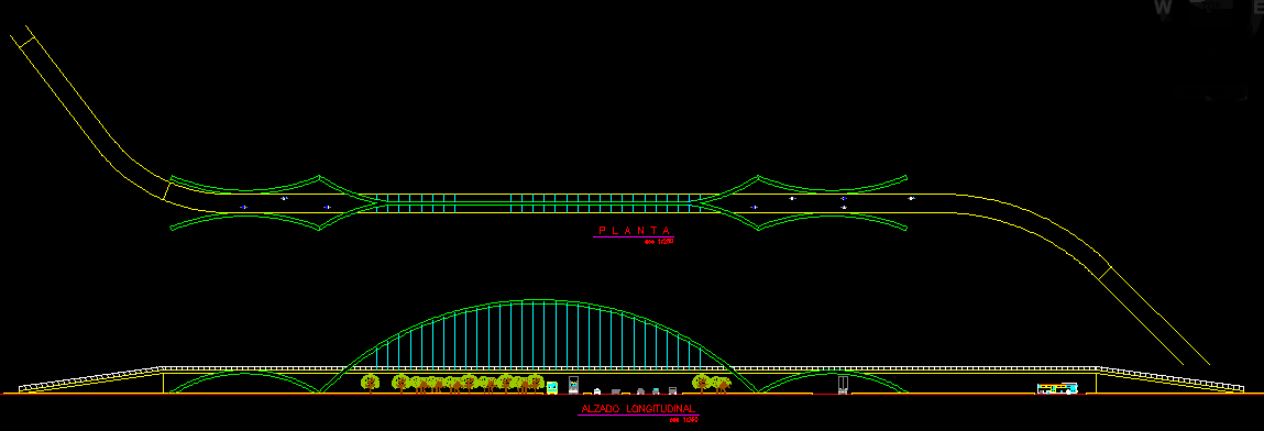 This Concrete Bridge CAD drawing file provides a detailed structural layout, including both elevation and plan views. The bridge design displays the arch curvature, deck slab alignment, and side approaches with precise dimensions. The AutoCAD drawing showcases reinforcement structure, span length, and the overall geometry of the concrete bridge, suitable for engineering visualization, structural analysis, and design documentation. The plan view offers a clear layout of the bridge roadway, approach curves, and central span, reflecting professional CAD drafting standards.