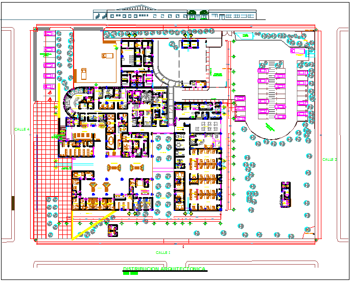 Municipal Hospital dwg file. Layout plan of with furniture detail, operation theater, reception area, parking space and elevation design.