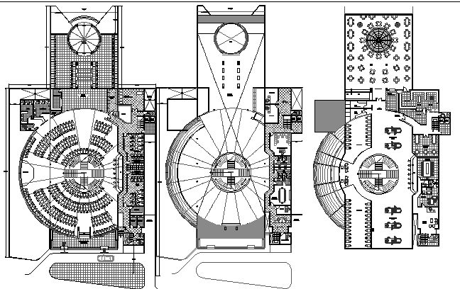 bingo building dwg file, complete architectural detail of the building , the top view of the building is in circular form, with the stage in the center and seating around the in circular direction, and even others in straight direction