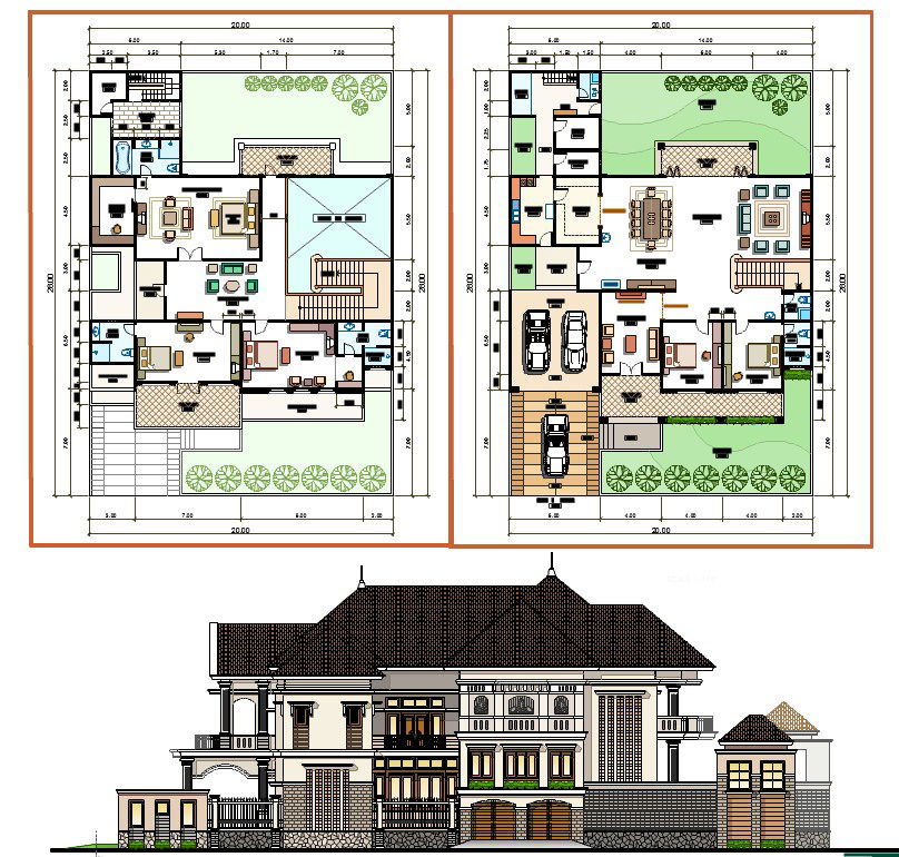 Family Bungalow dwg file. The architecture layout of ground floor plan and first floor plan along of furniture detail also have elevation design of family bungalow project.