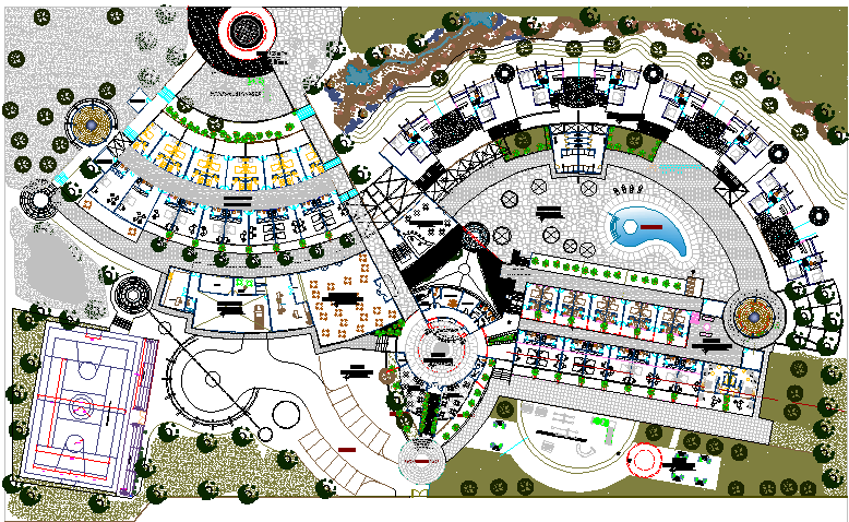 Ecological hotel dwg file, a luxurious hotel , with lawn, garden, swimming pool, disco, party club, rooms, grand spacing, very attractive view, complete plan of the hotel