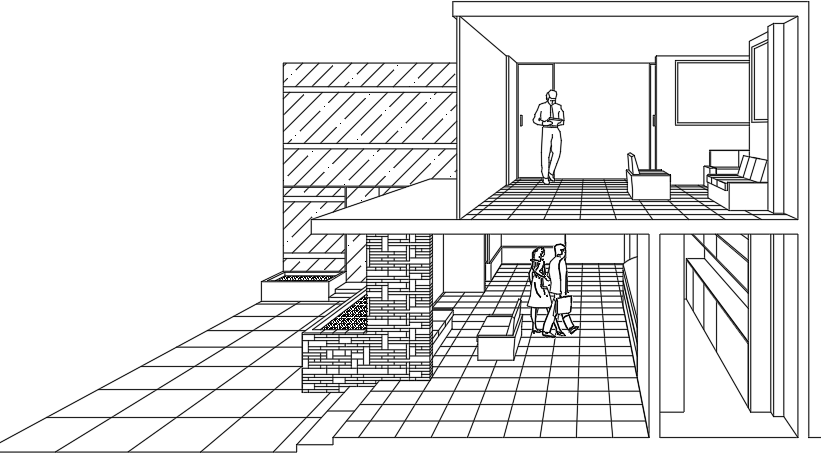 Hotel entrance and up stairs lounge interior view section DWG, Hotel entrance and up stairs lounge interior view section Download file.
