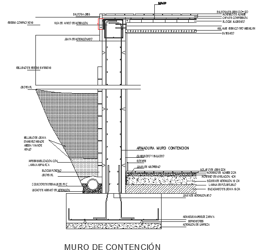 Here the detail drawing of retaining showing sectional elevation including material classification, reinforcement details, foundation details, and other required details in autocad drawing.