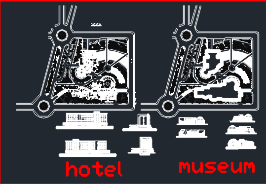 museum and hotel dwg file, layout plan of museum and hotel both, swimming pool in hotel, furniture , rooms, museum detailing