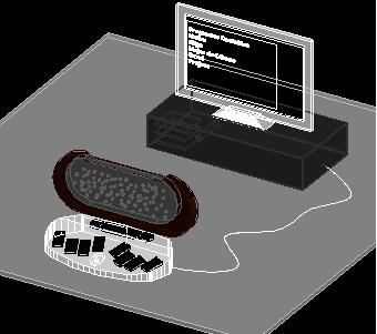 This 3D Computer Desk AutoCAD DWG file presents a detailed workstation setup design, including a monitor, desk surface, and storage unit with accurate proportions. The 3D rendered view showcases the ergonomic placement of a computer system, emphasizing both aesthetics and functionality. The model includes the tabletop structure, CPU cabinet, connected devices, and seating area, designed to provide maximum comfort and usability for office or home workspace layouts.