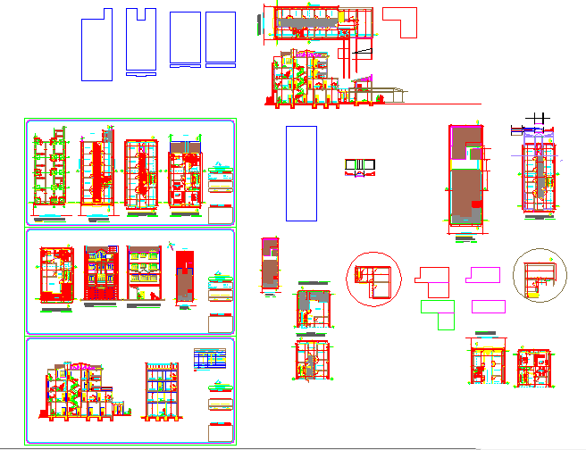 Here the autocad drawing of appartment building showing detail plan, sections, elevation and other required detail including dimension, architectural element detail, hatching and rendering in elevations and sections, roof plan, furniture detail, and human scale.