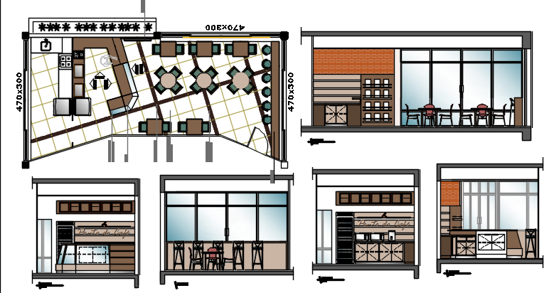 Coffee bar project dwg file, excellent design of coffee bar, coffee tables and chiars , entrance design etc
