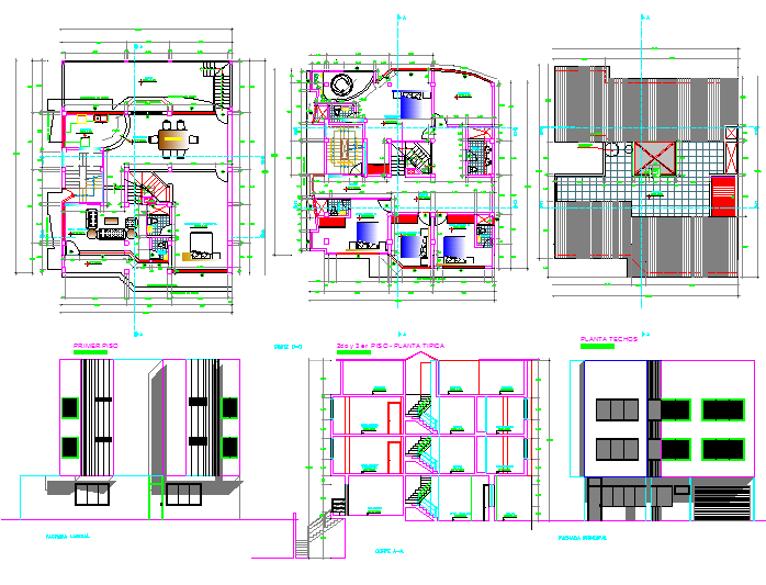 Multifamily dwg file. Installation of electrical plan and sanitary ware, structure plan, section plan, elevation design of Multifamily project.