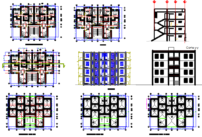 Multifamily Building dwg file. The architecture layout plan 3 level floor plan, section plan and elevation design also have detailing of construction project.